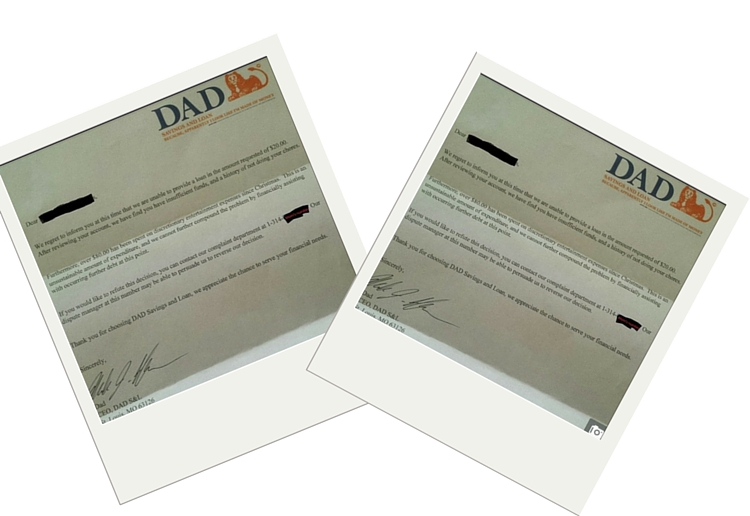 The letter reads, ‘We regret to inform you at this time that we are unable to provide a loan in the amount requested of $20.00. After reviewing your account, we find you have insufficient funds, and a history of not doing your chores.’