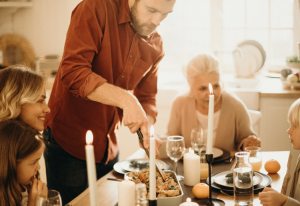 A happy family enjoying a frugal Christmas dinnerhristmas dinner table