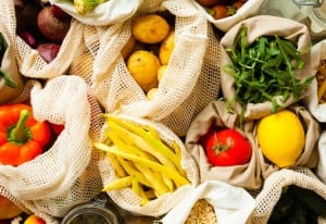 Top view of fresh vegetables in eco mesh bags close up. Food shopping zero waste concept