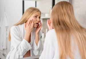mum looking at acne skin in mirror