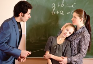 Strict teacher scolding girl in a classroom.Mother defending daughter, Concept of supporting, maternity