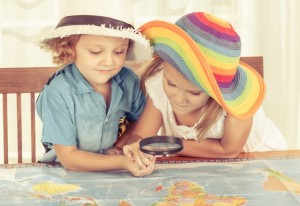brother and sister are considering a world map with a magnifying glass at home