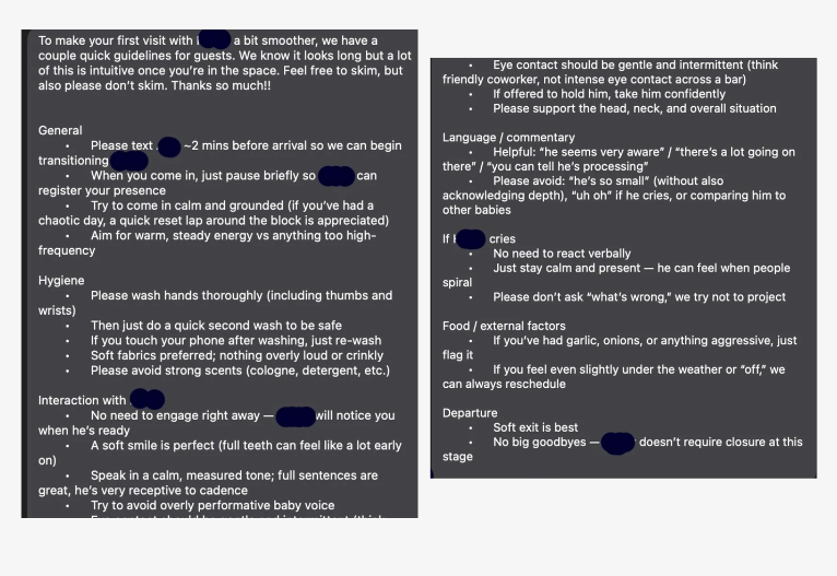 “To make your first visit with the baby a bit smoother, we have a couple of quick guidelines for guests. We know it looks long but a lot of this is intuitive once you’re in the space.”