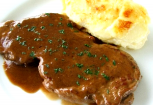 Diane Sauce served on a juicy steak with a side of mashed potato topped with cheese