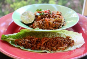 A delicious-looking bowl of san choy bow filling with lime, and a ready-to-eat serving of choy bow in a lettuce leaf.