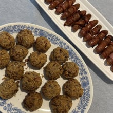 One of my friends decided to host a last-minute Friendsmas dinner party and requested everyone to bring some festive appetizers to share with the group. Thankfully, for a conveniently located IGA, I was able to effortlessly grab the necessary ingredients to make French Onion Stuffing Balls and Bacon-wrapped Beef Sausages for the party.