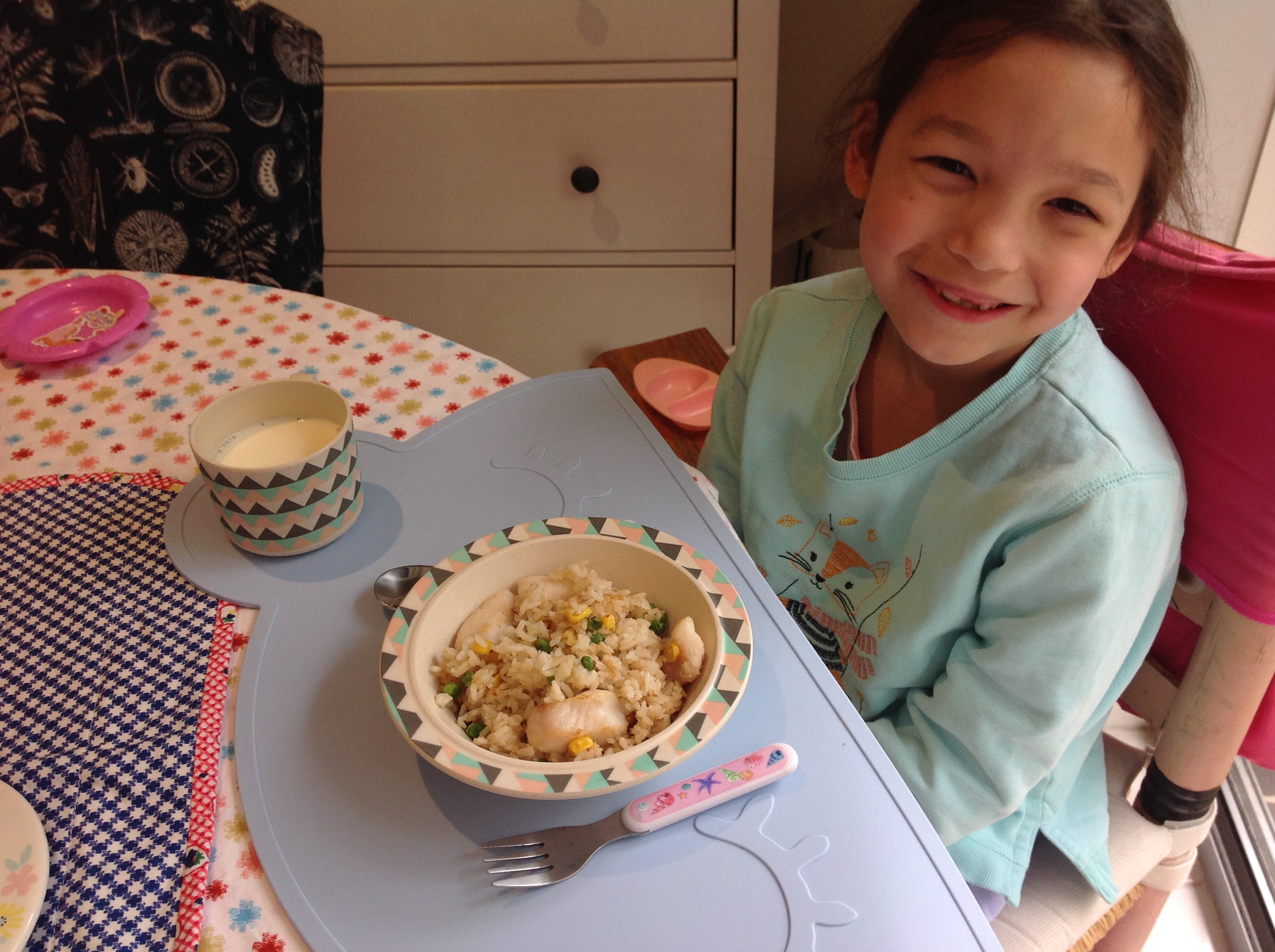 I cut up bacon and chicken for her and showed her the ‘quick cook’ button so that she could use the pan like she would a frypan. She used the good old tupperware chopper to do the onions and threw the lot in. Once they had cooked nicely, she put in two cups of aborio rice, then chicken stock to cover the rice, about 2cm over the top. She put it on the Brown Rice function and we went outside to play cricket! It didn’t even take half an hour, and the house smelled so good. I forgot to take a photo of her with her masterpiece, and when I went to take a photo afterwards, it had all disappeared. The kids all had seconds, and my husband had thirds! There was even enough for my dad who popped in on his way home from work – my daughter was so proud to be able to dish it up for him.