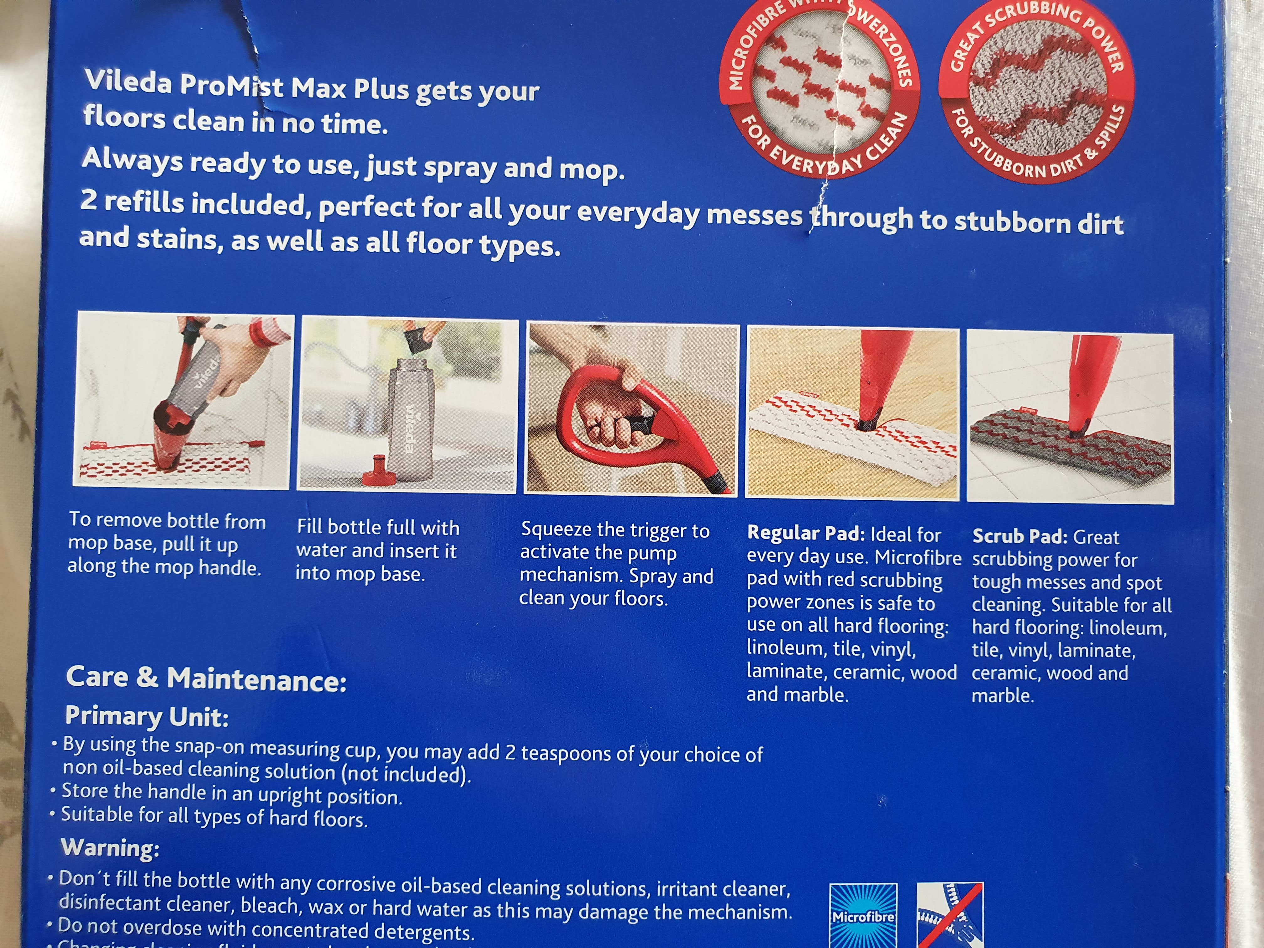 I am the proud owner of the Vileda spin mop and let me tell you being 7 months pregnant I quickly fell in love with the promist Max plus spray mop. I don’t have to lunge around the big bucket of water I just fill up the spray bottle and away I went. It’s very easy to change over the regular mop pad to the scrub pad for high traffic areas.