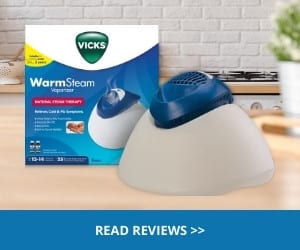 Vicks Warm Steam Vaporiser on kitchen bench with link to Read Reviews